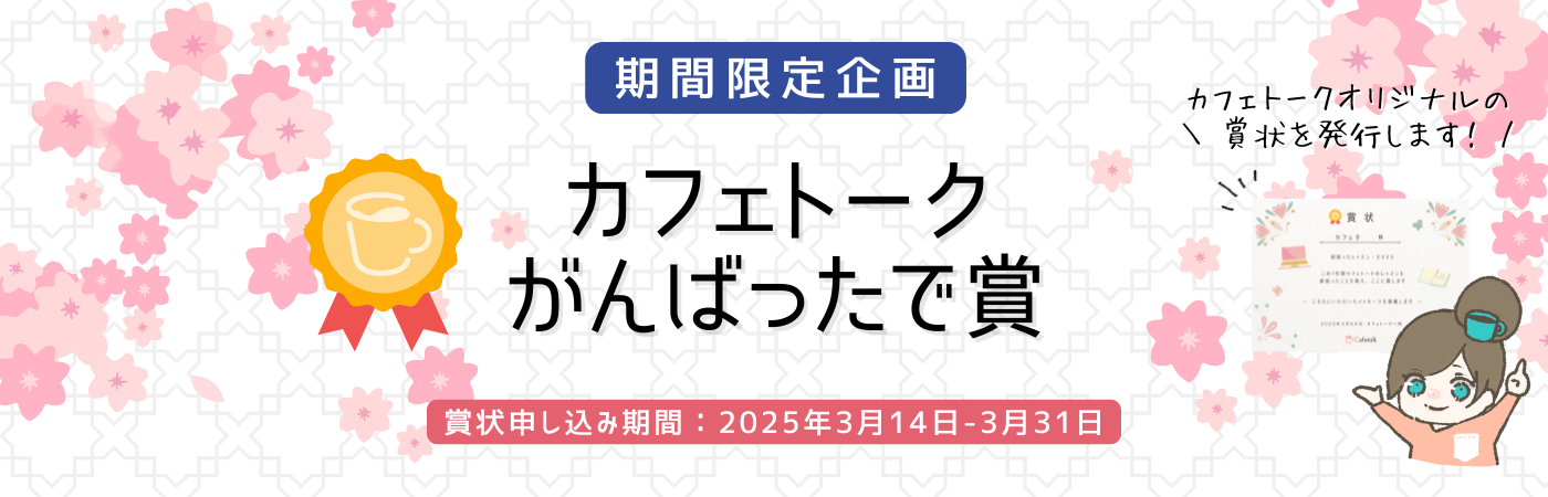 - カフェトークのレッスンを2024年4月1日〜2025年3月31日の間に、ご受講している方が対象となります。