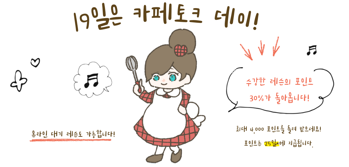 매월 19일 카페토크데이에 아래 표시된 추천 레슨을 수강하면 카페토크데이 스페셜 배지*를 획들할 수 있습니다!