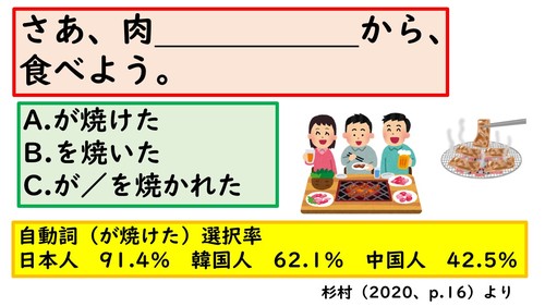 日本語母語話者は普段意識しないが、他の言語話者から見ると他動詞を使うべき場面のようなのに日本語話者は自動詞を使いたがるという現象が存在するらしい。このことは守屋(1994)、杉村(2020)などの研究で指摘されており、実際に日本語母語話者が例(2)のような場面でほぼ100%自動詞「焼けた」を選択するのに対して、日本語学習者は他動詞「焼いた」や受身形「焼かれた」を選択するという調査結果が報告されている。