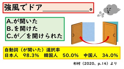 自然現象であっても「強風でドアが開いた」のような外力による作用である場合、日本語話者は自然に変化が起きた点に注目してほぼ100%自動詞「開いた」を選択するのに対し、中国語話者や韓国語話者は強風による影響の方に着目して「強風でドアが開けられた」のような受身形を選択する割合が高いという(杉村2020,p.14)。