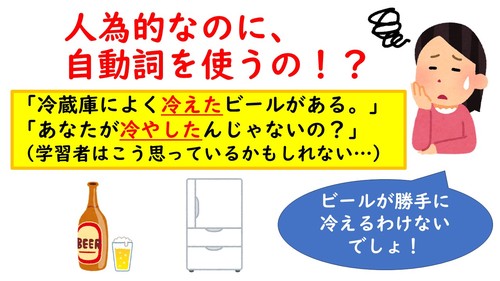 人が意図的にした行為の結果として対象が変化する場合はなおさらで、例(8)や(9)のように誰かが人為的に「焼いた」「冷やした」結果、対象物が「焼けた」「冷えた」場合に、日本語では対象物が変化したほうに注目するが、非母語話者は誰かの人為的な行為のほうに目が行くため、「人為的な事態なのに自動詞を使うのは変だ」と思われるわけである。