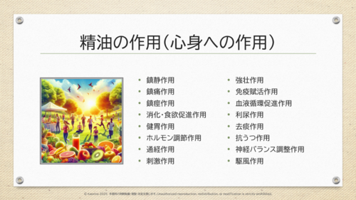 このレッスンでは、メディカルアロマの基礎を学びながら、心と体の状態に合わせた精油の選び方を身につけていきます。