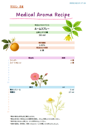 その時のあなたが必要としている精油でこんな感じのレシピをお作りします