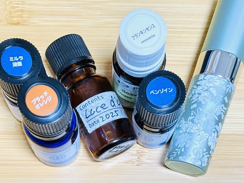 ついさっきブレンドを終え、これから2週間ほどブレンド精油を熟成させたあと、オードトワレにしてからもう少し熟成させてプレゼントラッピングをします。