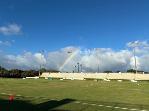 撮影最終日は今シーズン最後の試合を撮影しました。帰宅ラッシュの中、ホノルル国際空港から西のパールシティー(真珠湾)を更に越えた所にある試合会場のワイピオ・サッカー・フィールドに着くとレインボーが迎えてくれました。