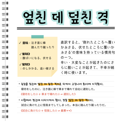 そういう時ってありますよね。本当に悪いことが続いて’ついてないな〜’って思ってしまう日が。そんな状況で使える韓国語の慣用句を紹介します。[엎친 데 덮친 격]です。似た表現で「설상가상, 산 넘...