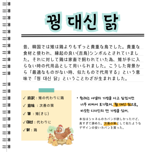 以上で韓国のことわざ、「꿩 대신 닭」のご紹介を終わります。ありがとうございます!