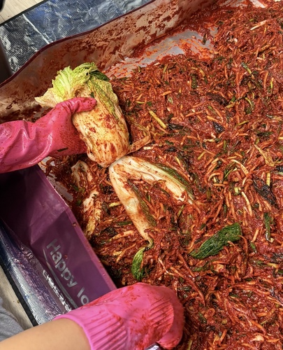とにかく沢山の材料を混ぜてペースト状にしたもの(ヤンニョム)を、白菜一枚一枚にすり込んでいく作業を行いました。