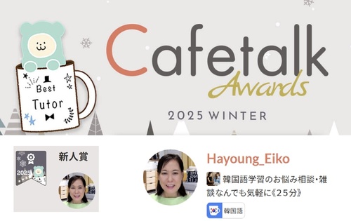 こんにちは。 日本語・韓国語講師の hayoung_Eiko です(^^)   このたび、2025年下半期カフェトークアワードにて【新人賞】を受賞することができました*^o^* また併せて、12月...