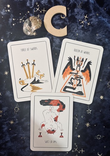 カード:ソード3、ワンドクイーン、カップ2(逆)