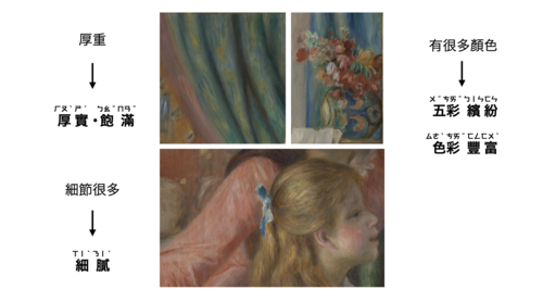 • Step 1. 目に見えるものを「直接描写する」 まずは正確な語彙を学びます。例えば、画面の配色構図、あるいは描かれている人物の動作などです。