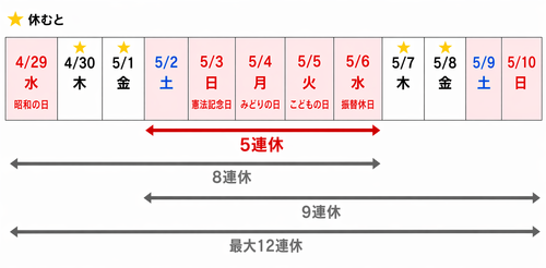今年は、4月29日から5月10日まで、最大で12日間が休みになります。