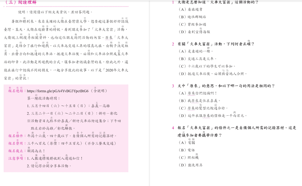 視程度也會摘選新聞文章、台灣學生國文考試文章做為教材