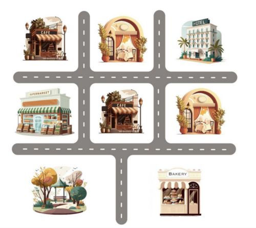 2 - bakery, hotel, library, cafe, entertainment, supermarket