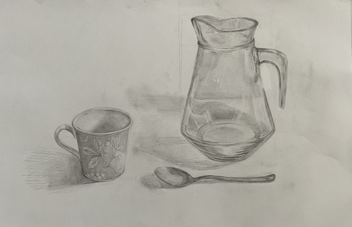 このレッスンでは、果物・花・コップ・スプーンなどの身近なモチーフをじっくり観察し、鉛筆で描き写していきます。