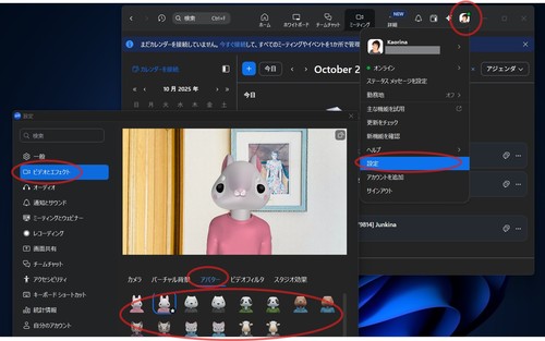 ⑤カメラ画像が写っているところの下の〔アバター〕をクリック