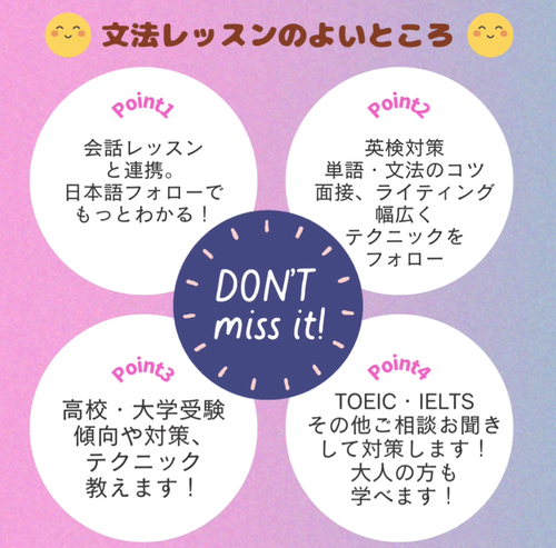 日本人としての弱点や悩み、勉強法のフォローもご希望に合わせて、対応させていただきます。