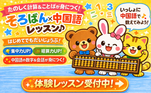あそびながら♪ そろばん&中国語デビュー!そろばんで計算力を伸ばしながら、中国語も楽しく学べるレッスンです♪数字・簡単な会話を自然に身につけられます!