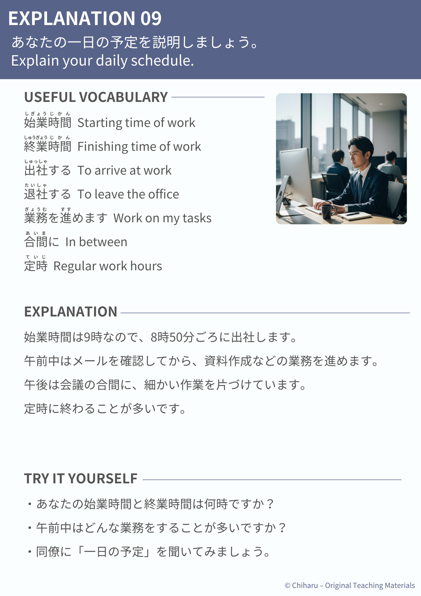8–10: Work-related topics – explaining your schedule and tasks at work