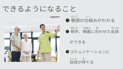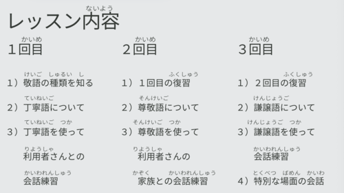 かいごの しごとに やくだつ けいごを 3回のコースで まなびます。