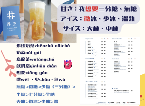 ドリンク店での注文: 甘さ・氷の調整、よくあるドリンク名をマスター