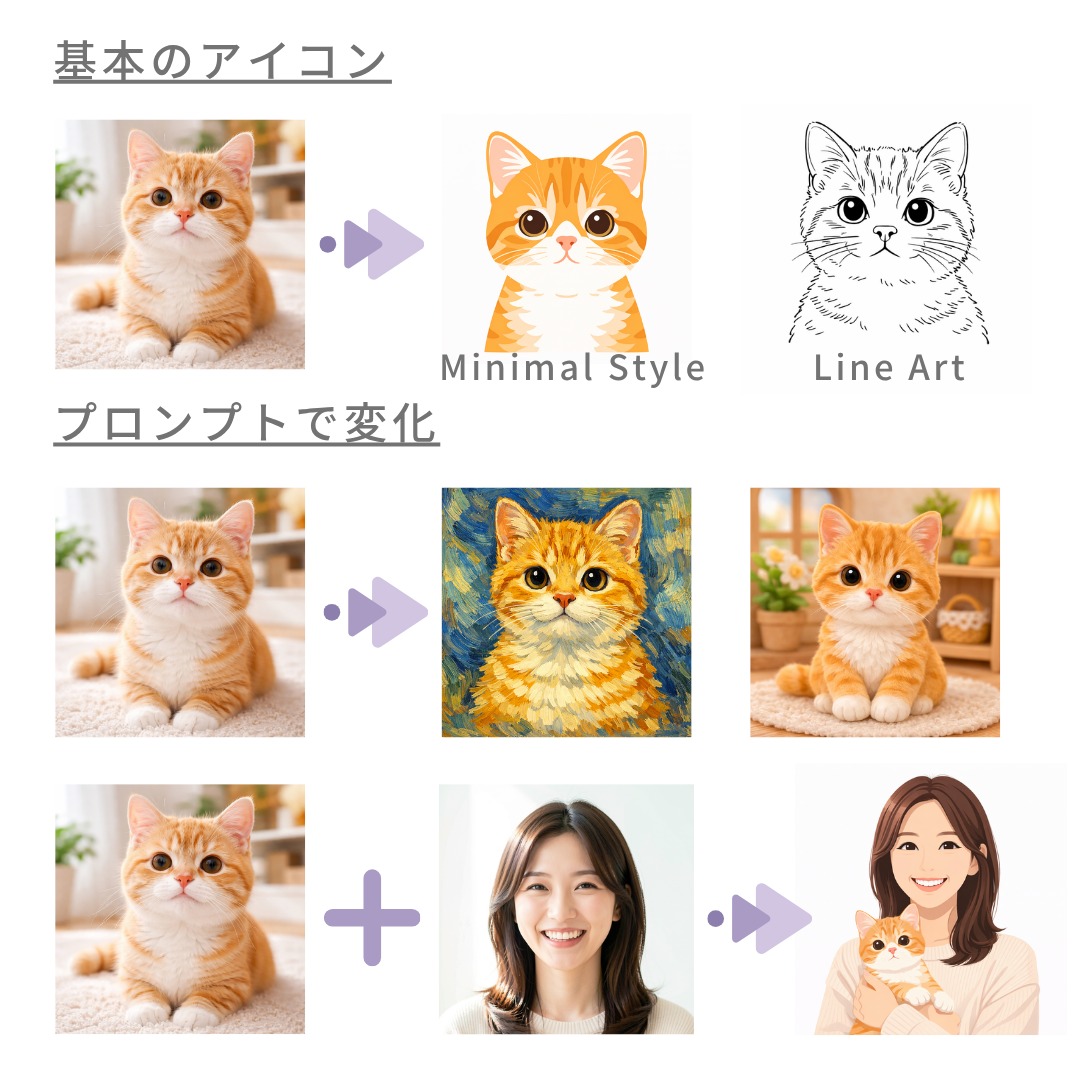 2種類のアイコンを作った後は、 「水彩画風にして」「〇〇をしているイラストにして」など、 追加の指示を出してイラストを変化させてみます。