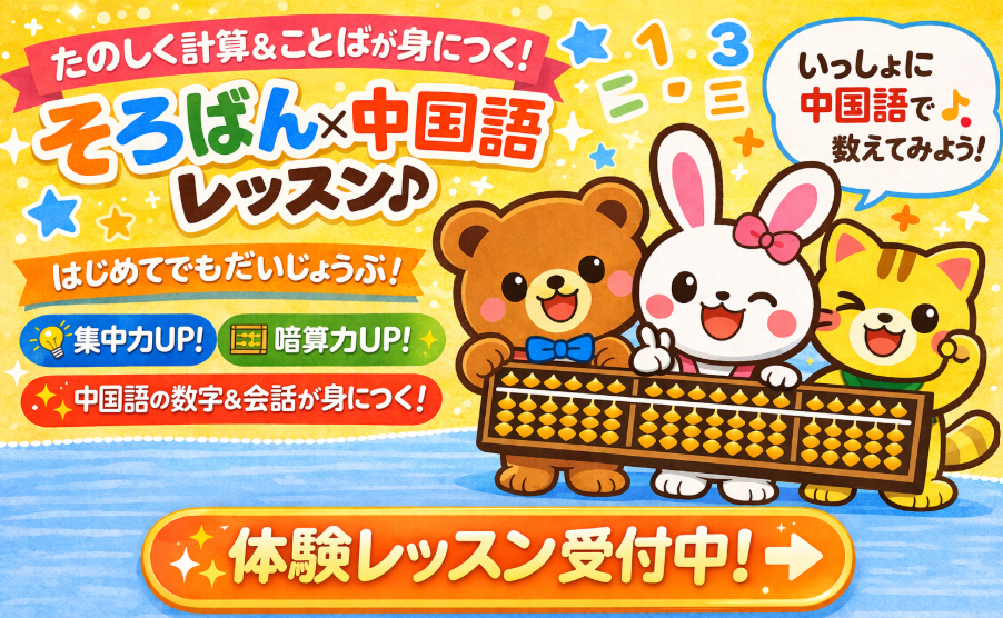 計算力+語学力を同時に伸ばす!実力アップレッスン。そろばんで計算力を伸ばしながら、中国語も楽しく学べるレッスンです♪数字・簡単な会話を自然に身につけられます!