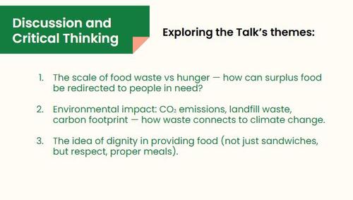 This lesson aims to improve listening comprehension using real, authentic English (TED talk). Expand vocabulary and expressions related to social issues, business, and environmental contexts. Practice speaking and expressing opinions on a meaningful topic. Encourage critical thinking about societal issues such as waste, inequality, sustainability. Understand and discuss a complex social/environmental issue in English. Learn and practice advanced vocabulary and expressions related to business, waste management, environment, and social issues.