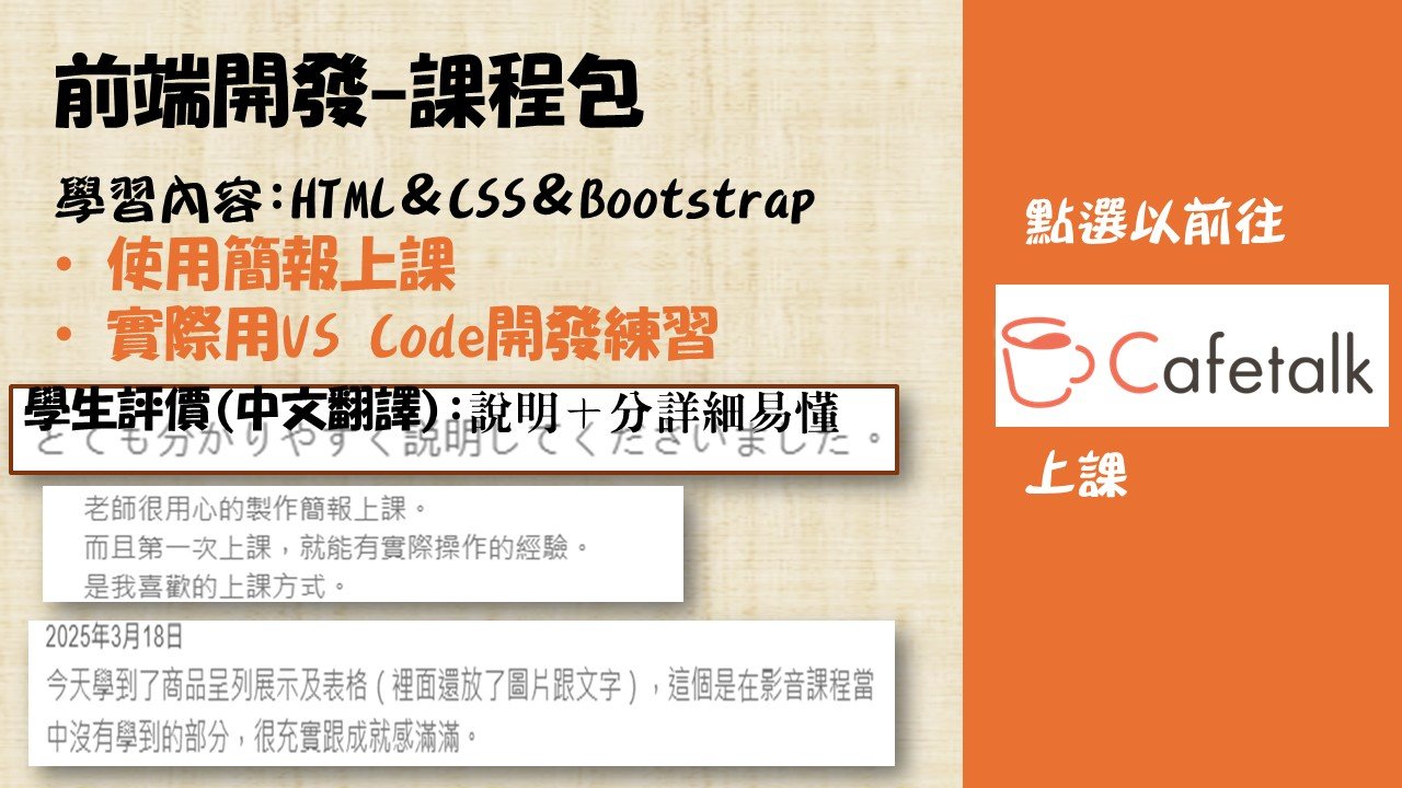 另外附上我在Cafetalk教的總科目介紹海報,還有以前學生給我的評價(包含成人自學或是成人轉職等評價)。