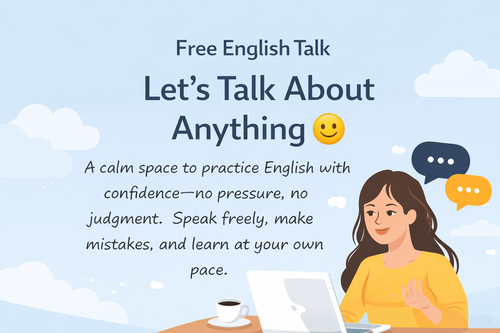 A calm space to practice English with confidence—no pressure, no judgment. Speak freely, make mistakes, and learn at your own pace.