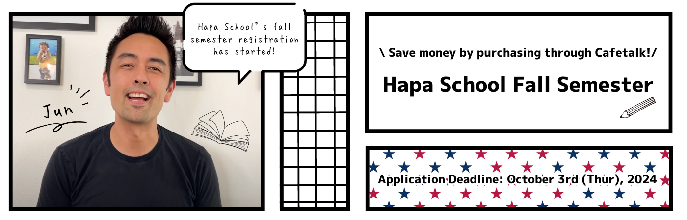 *Hapa School programs will not be held on Cafetalk’s website. Please check the course information you will receive from Hapa Eikaiwa after registration.
