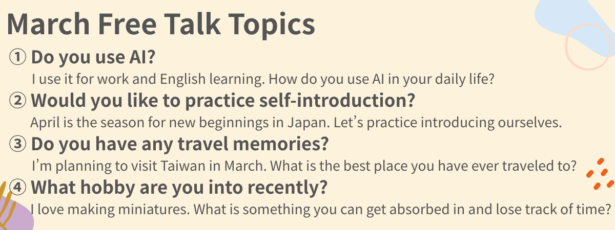【15-min Free Talk welcome. Let’s enjoy speaking Japanese together. I also offer lessons where we create profile icons using ChatGPT and Canva. I’m visiting Taiwan in March, so I’d love to hear your recommendations! Thank you for ranking me No.1 in the New Tutor Ranking.】
