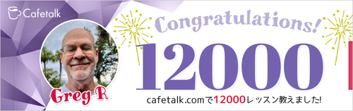 Q. Greg先生こんにちは!自己紹介をお願いします。 A. カフェトークのみなさん、こんにちは。ミネソタ州で25年以上、子供から大人の方までたくさんの人に英語を教えてきました。2014年の10月に引退を決意したのですが、ミネソタ州でこれ以上冬を過ごすのが嫌でした(1月には-29度にまでなるんです…)クリスマスの2日前に思い立って、簡単な荷造りをして、愛犬を連れ、フロリダ州のベニスに移り住みまし...
