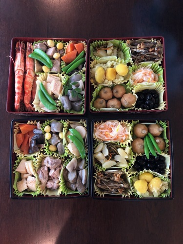 正月(しょうがつ)家族(かぞく)でおせち料理(りょうり)(た)べます。毎年(まいとし)(わたし)(つく)ります。