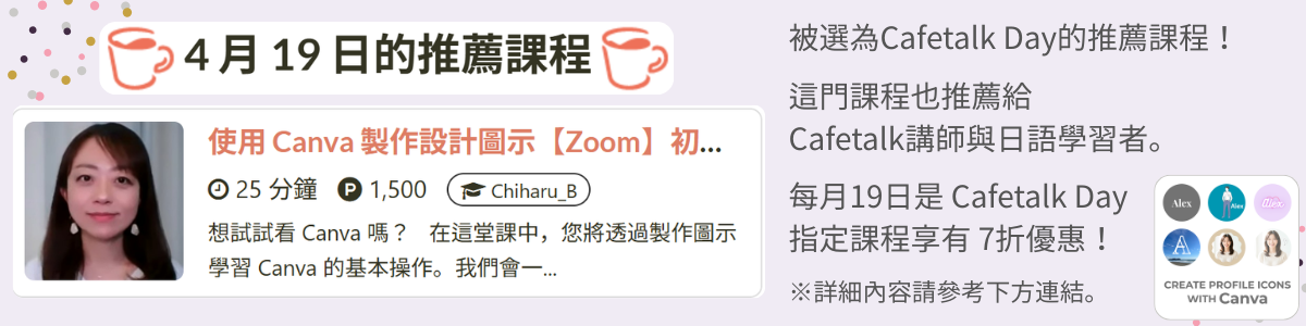 このたび、私のレッスンを「カフェトークの日」のおすすめレッスンとして掲載していただきました! カフェトークの日は、毎月19日に開催されるキャンペーンで、対象レッスンが30%オフになります。 ご紹...