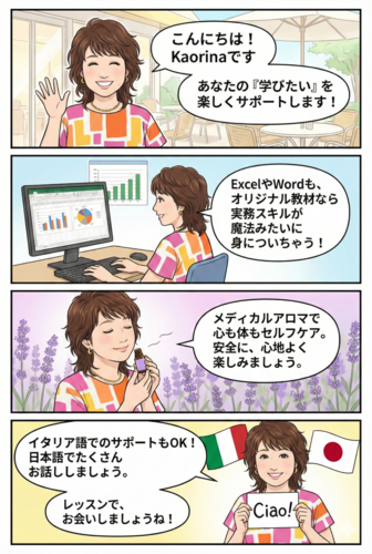 Su Cafetalk offro lezioni di lingua giapponese, Microsoft Office (Excel, Word, PowerPoint) e aromaterapia medica.