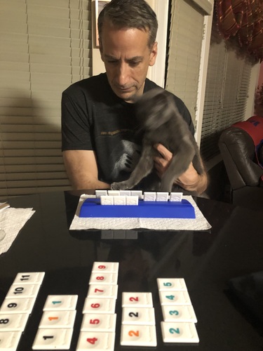 I love playing all kinds of games (especially with the help of a cuddly kitty)! Word games like Scrabble, Wordle, Scattergories, and Taboo are so fun, but I also like math games (like this one shown here, Rummikub) and more general board games (like Monopoly). If playing word games is fun for you, too, we can play some virtually and improve your English while doing so.