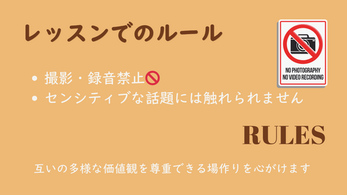 ◆レッスン中(ちゅう)、宗教(宗教)・政治問題(せいじもんだい)などのセンシティブな話題(わだい)には触(ふ)れられません。