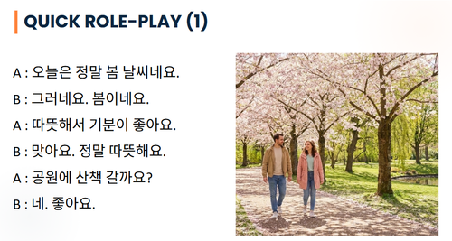 自己紹介、天気、道案内、注文など、様々な実戦状況を中心に [単語 → 重要表現 → ロールプレイ] の順に進めます。その状況に合った表現を口に馴染ませることが目標です。単語を並べるだけでなく、短くても正しい文章で話せるように練習しましょう。