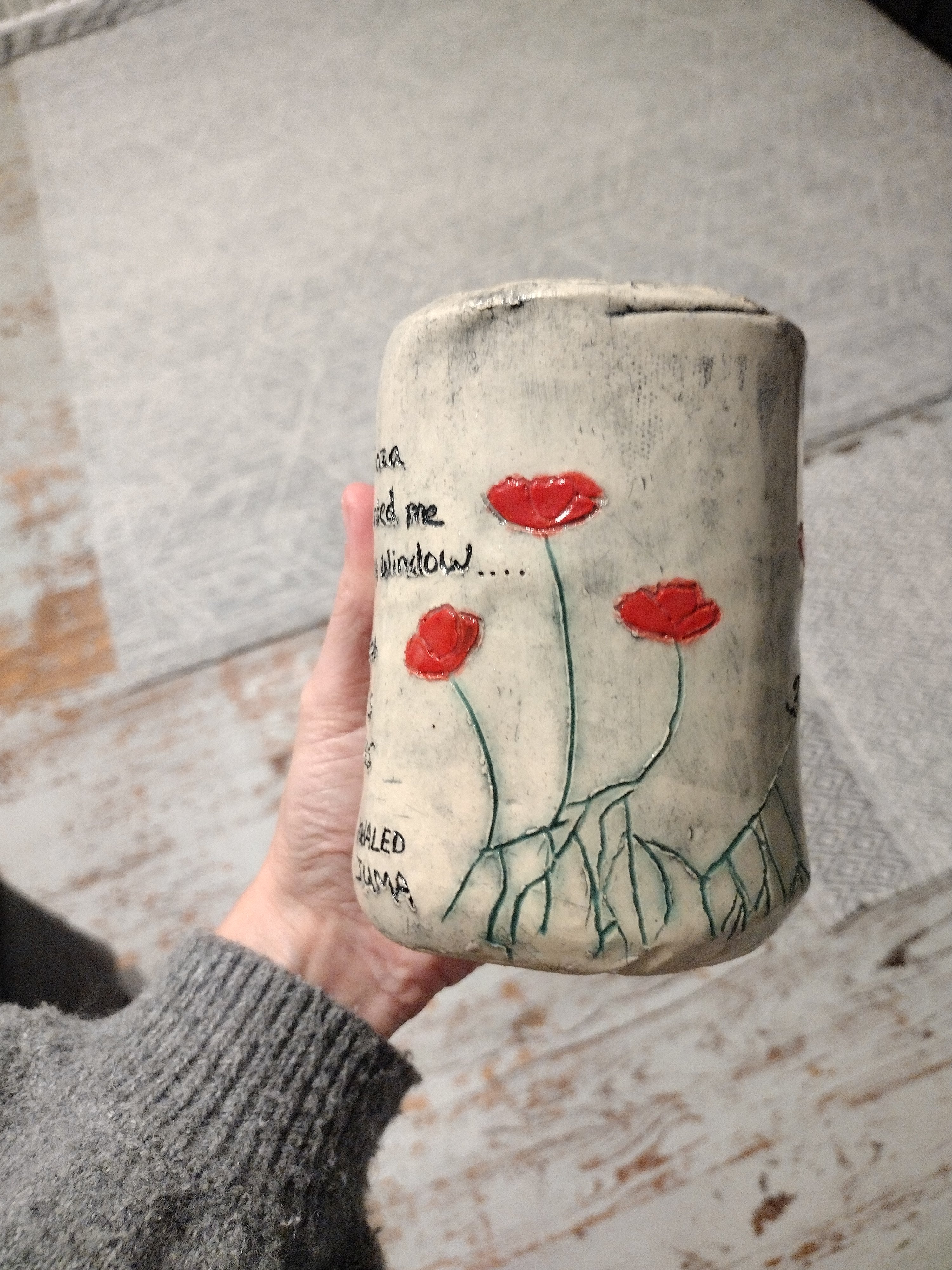This was my first ever official ceramics project. I decided to make a slab vase and carved poppy flowers as well as part of a poem by a Palestinian writer.
