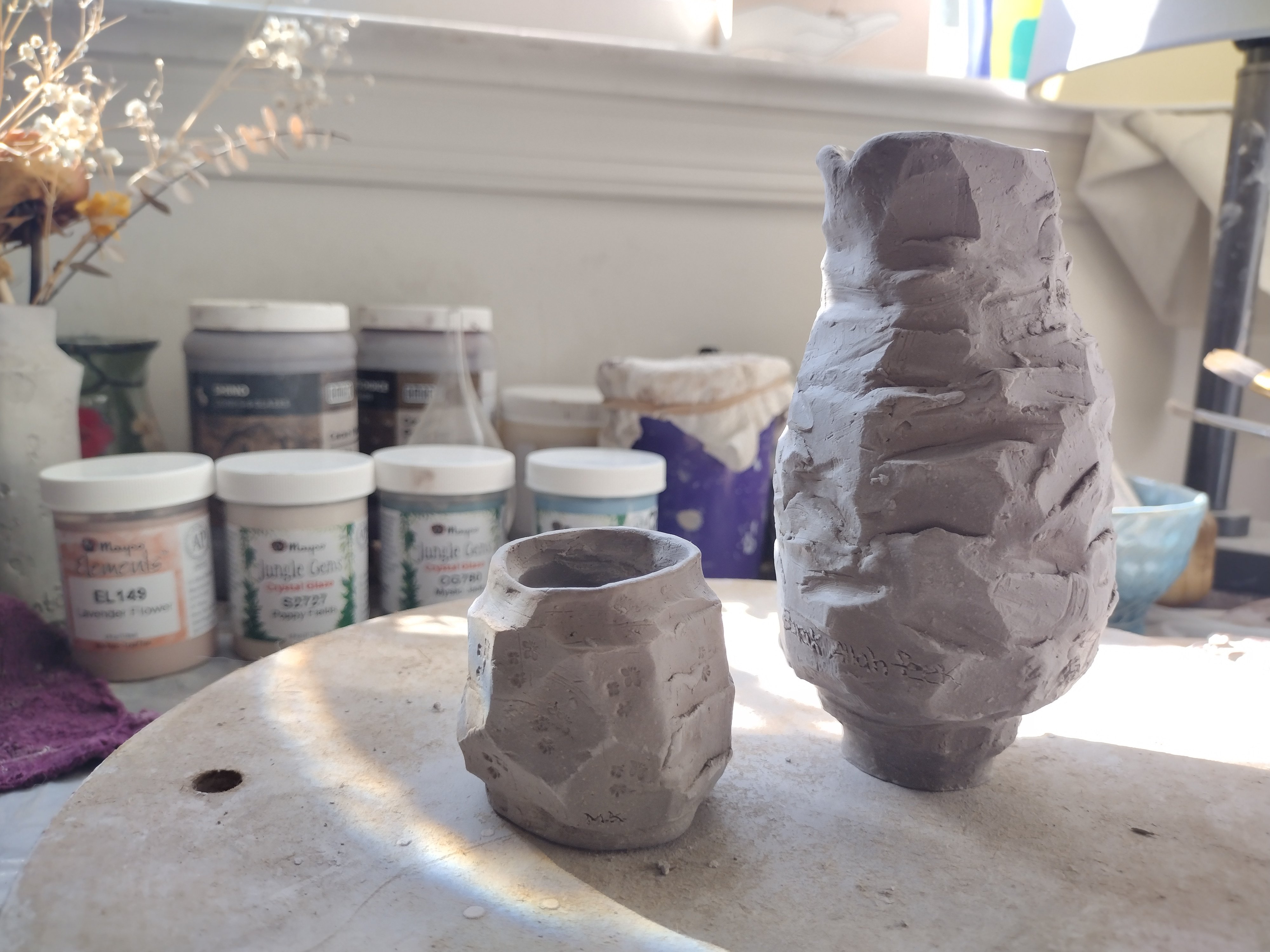 I have the most fun experimenting with the kirunoki method in pottery. I sculpted a sake container with a little cup.